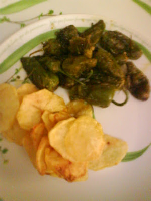 Pimento padron salteado em azeite e alecrim (e sal suficiente para provocar imediatamente um avc), com batata doce frita.